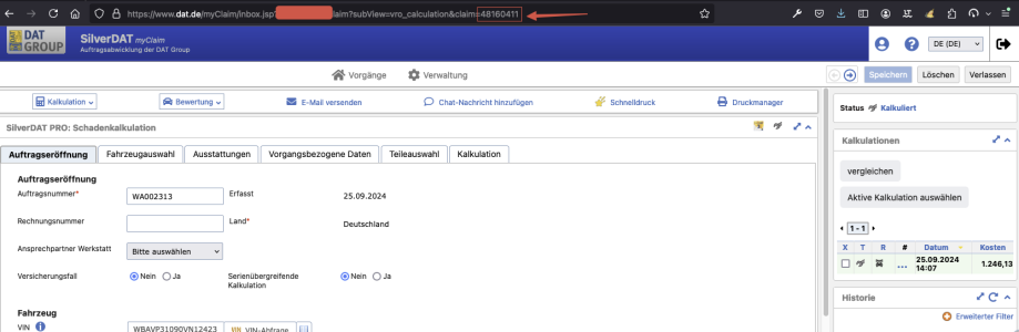- Kopieren Sie die Auftragsnummer aus der URL (ACHTUNG: Bitte nutzen Sie nicht die Vorgangsnummer sondern die s.g. Claim Nummer aus der URL)