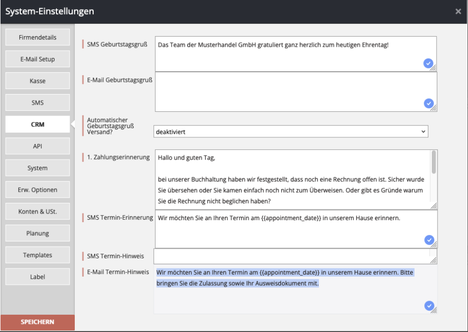 - Tragen Sie im Feld „E-Mail Termin-Hinweis“ den gewünschten Hinweistext ein.