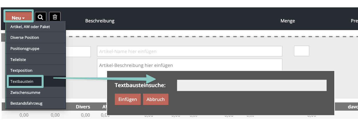 1. Textbaustein anlegenNavigieren Sie im Hauptmenü zum Bereich „Warenwirtschaft“. Wählen Sie dort im „+“ Menü die Kategorie „Textbaustein“ aus. Vergeben Sie eine aussagekräftige Bezeichnung und geben Sie den gewünschten Text ein. Speichern Sie den Textbaustein ab. Er steht Ihnen ab sofort als wiederverwendbare Vorlage zur Verfügung.2. Textbaustein auf einem Auftrag einfügenÖffnen Sie den gewünschten Auftrag (Rechnung, Angebot etc.). Klicken Sie im Positionsbereich auf den Button NEU, um eine neue Position hinzuzufügen. Wählen Sie als Positionstyp Textbaustein aus. Es erscheint eine Suche, wie Sie den Textbaustein unter Angabe des Suchbegriffs finden können. Wählen Sie den gewünschten Textbaustein aus – der hinterlegte Text wird automatisch als Position in den Auftrag übernommen.Tipp: Textbausteine eignen sich ideal für wiederkehrende Hinweise, AGB-Auszüge, Zahlungsbedingungen oder andere Standardtexte, die Sie regelmäßig auf Ihren Dokumenten verwenden möchten.