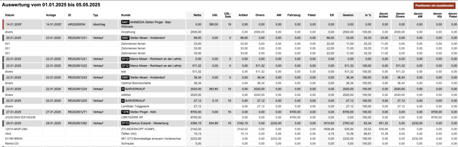 3. Um die Auswertung um die Auftragspositionen zu erweitern, klicken Sie bitte oben rechts auf den „Positionen ein-/ausblenden“ Button.