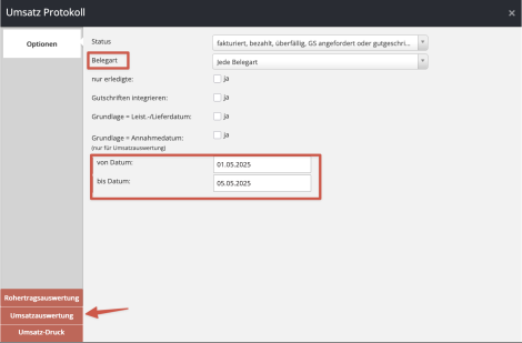 1. Geben Sie den gewünschten Zeitraum sowie die zu berücksichtigen Auftragsarten und Status an und klicken Sie links auf „Umsatzauswertung“: