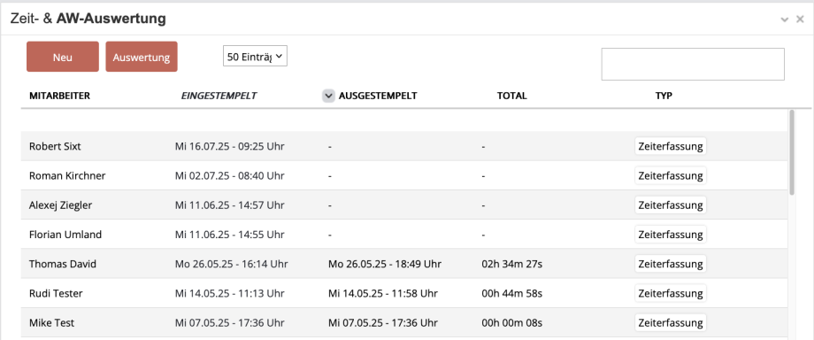 Die erfassten Zeiten werden – Admin Benutzern – im Dashboard im „Controlling“ angezeigt und können dort bearbeitet und ausgewertet werden.