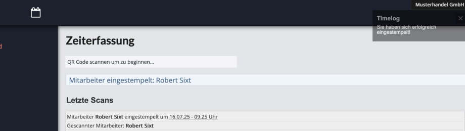 Scannen Sie die Aktion, im Beispiel „Einstempeln“, um die Zeiterfassung für den Mitarbeiter zu starten. Das Terminal bestätigt Ihnen jeden Scanvorgang im Modul „Letzte Scans“ und bestätigt jede erfolgreiche Aktion.